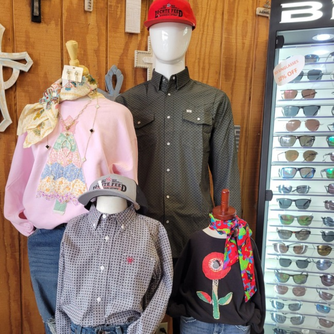 Immerse yourself in the charm of our carefully curated Western Wear collection. We carry top-tier brands such as Wrangler and Ariat, known for their exceptional quality and timeless style. Whether you’re on the hunt for the perfect pair of jeans, a stylish hat, or durable boots, we’ve got you covered. Ladies, we haven’t forgotten about you! We boast a wide selection of clothing tailored just for you, as well as unique pieces for our cowboys and budding young buckaroos!