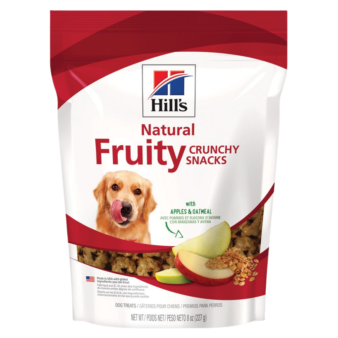 Hill’s Natural Fruity Crunchy Snacks with Apples & Oatmeal dog treats are delicious, natural treats made from only the best ingredients. Every treat is baked with real fruit pieces and will make your dog happy. Not artificially preserved or flavored.