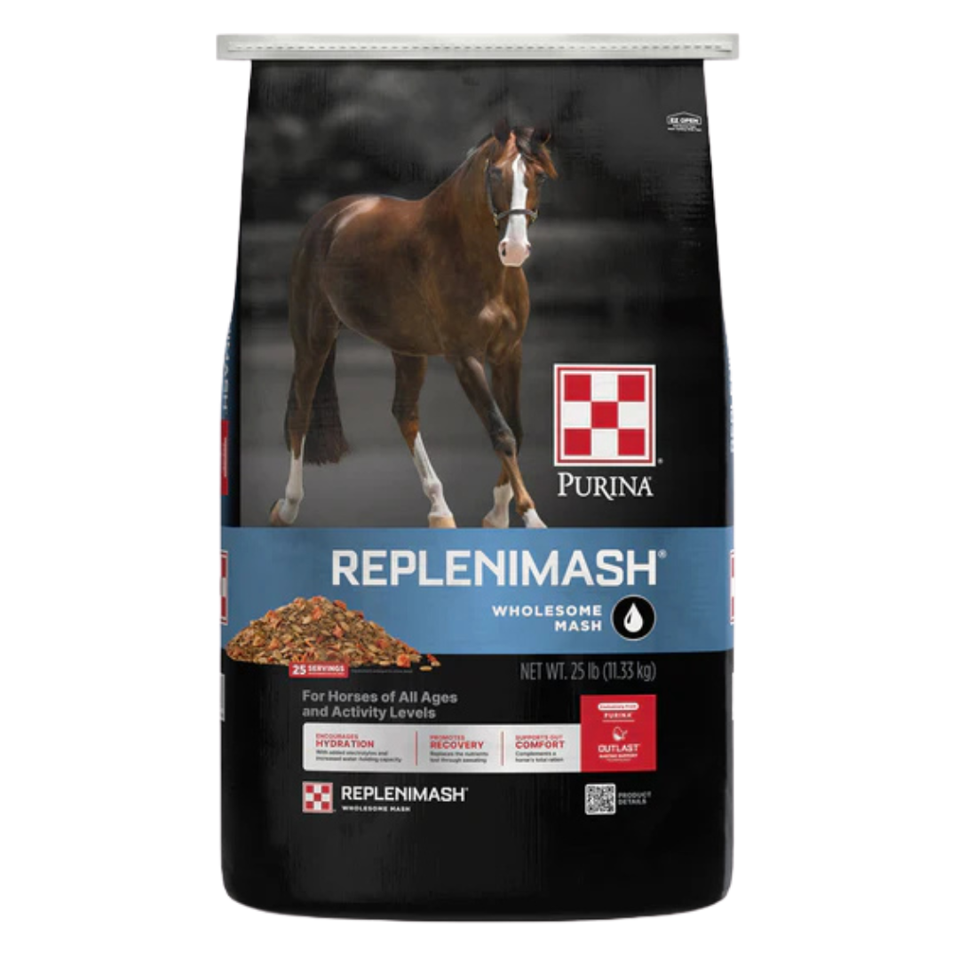 Purina RepleniMash™ Product is nutritionally balanced and made with wholesome ingredients your horse is accustomed to, plus a whole lot more. With Outlast® Gastric Support Supplement and a science-backed serving of electrolytes built-in, this tasty mash can help your performance horse feel his best or simply let your friend know you care.